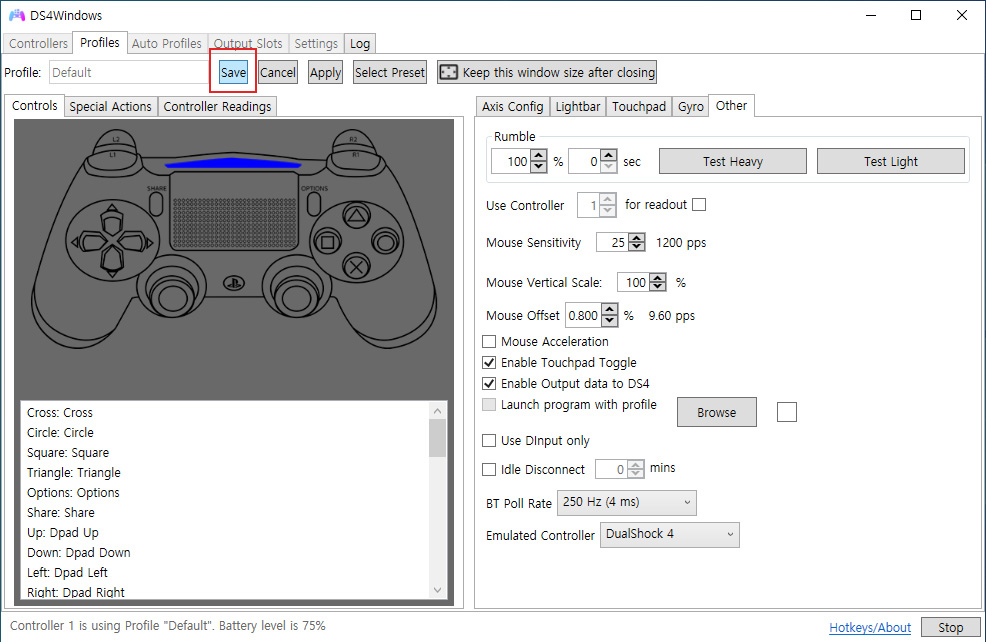 아래쪽에 보시면 Emulated Controller 부분을 xbox 360에서 DualShock 4로 변경하고 저장하면 됩니다.