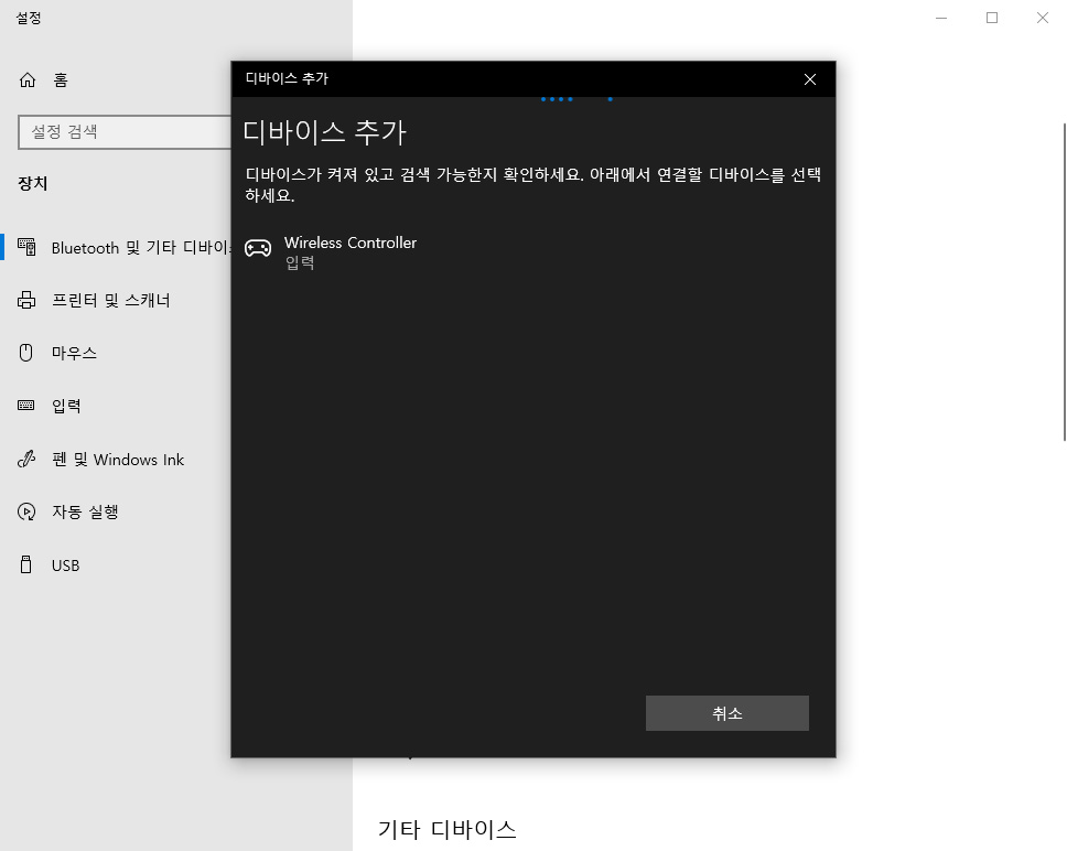다음으로 듀얼쇼크4에 있는 share버튼과 전원버튼을 3초정도 누르고 있으면 Wireless Controller 연결 중이라고 뜨는데요.. 클릭하면 pc하고 페어링이 완료됩니다.